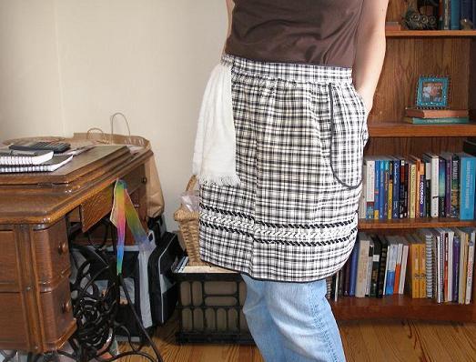 These are both so cute!!  The black and white one is trimmed with rick-rack, and the towel is attached with snaps, so you can take it off after you’re done cooking, and look cute when your guests arrive!  And the white one trimmed in red just has the cutest neckline!!  **SWOON!**  I love them both!!