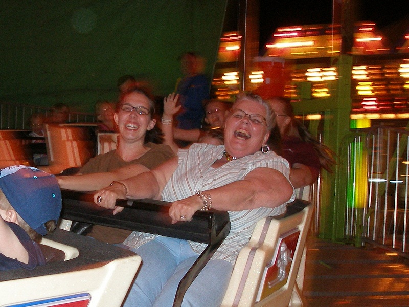 Last weekend we went to the Adams County Fair. Our friend, Richard, got us tickets to the truck pull and a parking pass, and my mom and Manuel had food coupons and a parking pass as well, so they joined us. We had a GREAT time. H loved the truck pull with all the noise and the big trucks (though I was cringing terribly from all the black diesel exhaust I was watching needlessly billow into the air – oy!), and we had a blast riding carnival rides, eating yummy carnival food (like the giant brat Rick got) and playing games. We stayed until past midnight! It was a fun treat for everyone.