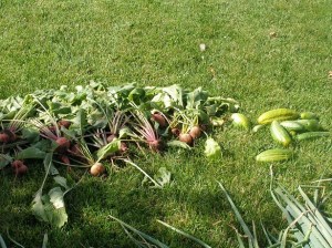 Also we have a lot of veggies coming on from the garden. Pictured are onions, beets, cucumbers and turnips.