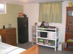 Then I got overwhelmed.  The basement and it’s junk room took over our lives.  I got obsessed.  Suddenly I was on a first name basis with the donation guy at the Goodwill, I was sewing curtains, my husband moved cabinets and counter tops to the garage.  I even called my mom over for reinforcements (and then wouldn’t let her do anything), like I said, Dummy.  I scoured craigslist for shelving.  I moved and rearranged and scrubbed walls.  I painted.  I panted.  I felt like passing out and giving up.  I gave up.  Then I read this post last week by the Organizing Junkie and I got up and did a little bit more.