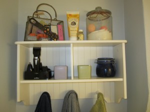 And the biggie – the shelf.  Cleaned out that basket, tossing anything expired or irrelevant (yes, irrelevant).  That basket in the bedroom closet caught the extra soap and the shower head until we are ready to use them.  We used the bubble bath up and the bottle is now a soap dispenser in the kitchen.  Hair ties were corralled in the blue jar, and lotion is up high so it doesn’t end up in the two-year old’s hair again.  After all that, there was room for my apothecary jar of bath salts that used to live on the tank of the toilet.  Not like I ever have time for a bath, let alone many baths to necessitate an apothecary jar full of salts – HA!  But it’s pretty and the kids enjoy them, I guess.  😉