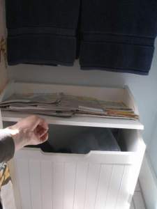 Then, lastly, in front of the toilet we have a little storage bench full of our extra towels and wash cloths, and on top; my many, many magazine subscriptions (yes, I’m a magazine junkie).  Hey, everyone reads in the bathroom, I need variety.  And it’s my only place without the kids.  It’s peaceful.  Just like every mom.