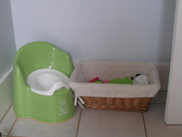 Under that shelf thing, we have the potty chair and a basket of bath toys.