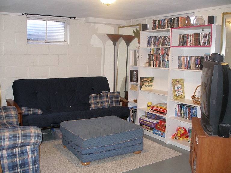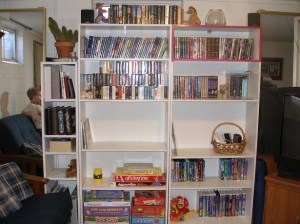 Since we ended up without any peaches on that Saturday, we now had a free Sunday on our hands (we had planned to be processing 150 pounds of fruit). I scored two bookcases on freecycle that were perfect for our basement. So we spent a good part of the weekend cleaning and rearranging and organizing. Went sent probably four garbage bags of stuff to the Goodwill, and there is probably another bag or two to go. The room still needs some curtains, the rope around the dart board, and a few little extras here and there, but it’s starting to shape up.