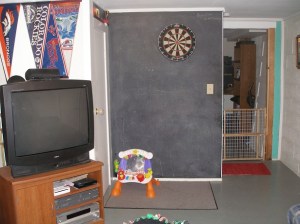 This made space in the basement’s second room to store canned goods, Rick’s tools and my craft supplies. That room is still in progress, as it needs the door rehung, cabinets mounted to the walls, new paint and some major organization. You can see a glimpse of it in the dartboard picture – it’s gated off and has a strip of ugly green paint on the doorway. But we made the biggest leaps towards having a put together basement that we’ve done since we moved in seven years ago.
