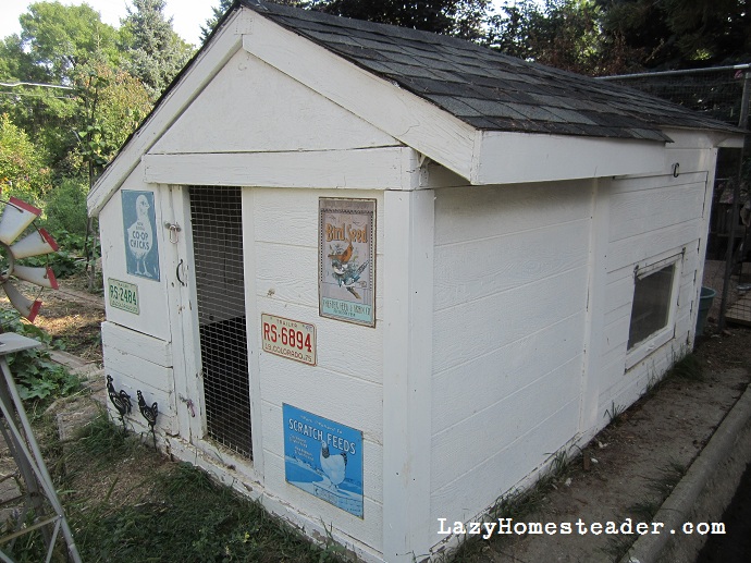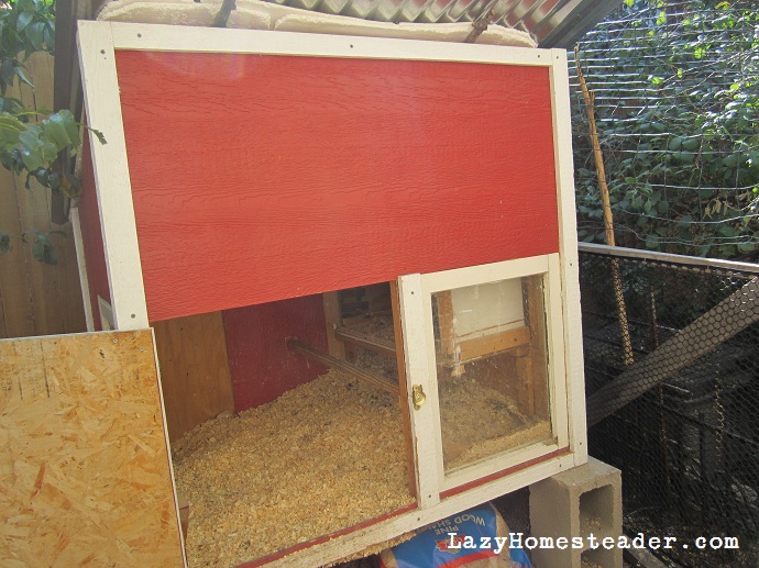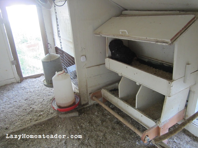 Inside the coop is a tree-branch roost that runs the length of the whole left-hand wall. On the right are nest boxes, feed and water and space to store supplies. The Zserdin’s had to give this coop a little TLC to make it warm enough for the winter by adding insulation and heat lamps.