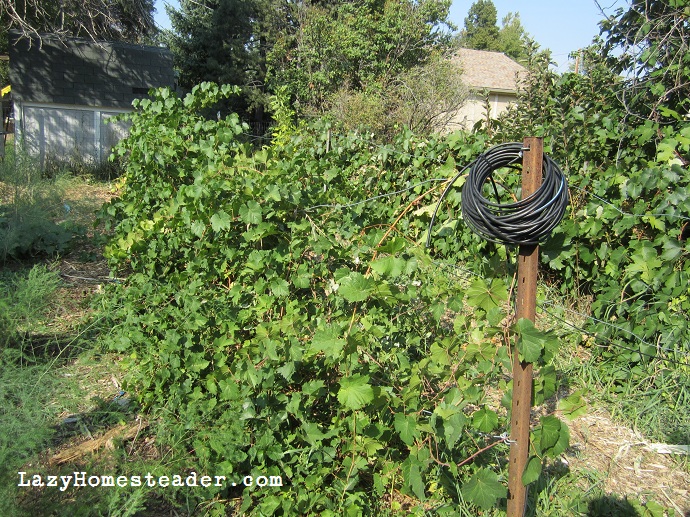 Vegetables were planted in a tractor tire, old tubs and in the ground. We wound our way through the tomatoes to the grape vines at the back of the garden.