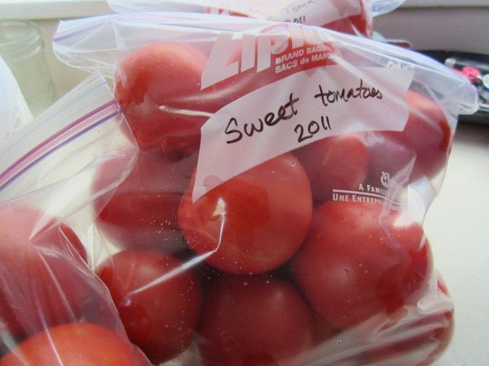 This is the simplest thing.  If you have the space, you might even be tempted to use this as your only tomato preservation method (we did for the last two years).  First, wash and dry the tomatoes.  Next, label your gallon size freezer bags.  Finally, place as many tomatoes in the bag as it will hold, zip it up, and put it in the freezer.  Done.