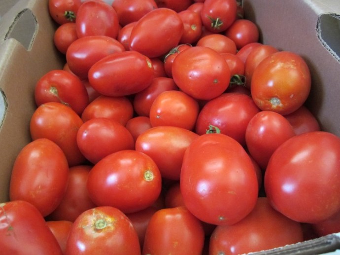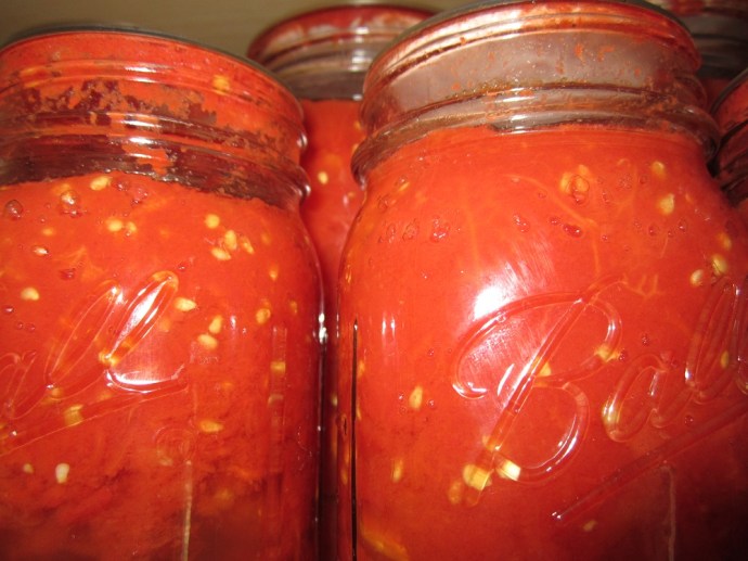 This is the main method we are using this year.  Most of those Romas are getting diced and put into jars.  There are lots and lots of posts out there talking about canned tomatoes and how the process works, so I’m not going to retype that here.  Instead, here is a link to a great tutorial.  The only thing I do differently is I chop those suckers up so I don’t have to do it on the cooking end when I open the cans.  -Note that I’m experimenting right now with whether or not it’s worth it to dice them, or if it just as good crushing the tomatoes.  I’ll let you know. –   And please, please ignore anyone who tells you to seed your tomatoes.  WHY?  Seriously.  If you don’t like tomato seeds, you probably don’t like tomatoes, so why are you even bothering.  These are the same people who always peel their potatoes.  To me, this is a total waste of time and energy.  But whatever.  Maybe I’m just lazy.  😉