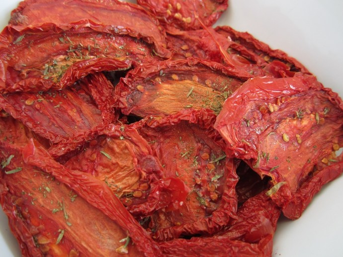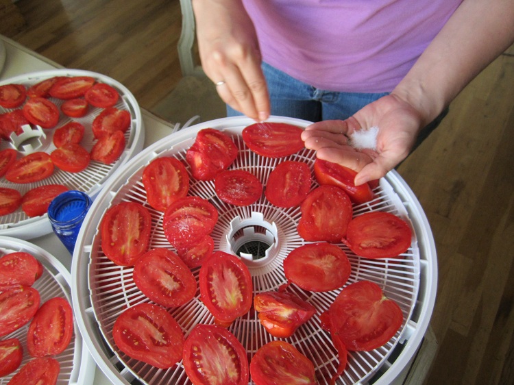Mmmmm… sun-dried tomatoes.  But without the sun.  I totally use the dehydrator.  It’s faster and I have two little boys in the yard, not to mention the chickens.  All of them, tomato hounds and dirt-flingers to boot.  Dehydrator is much safer – I might actually get dirt-free, uneaten tomatoes this way.